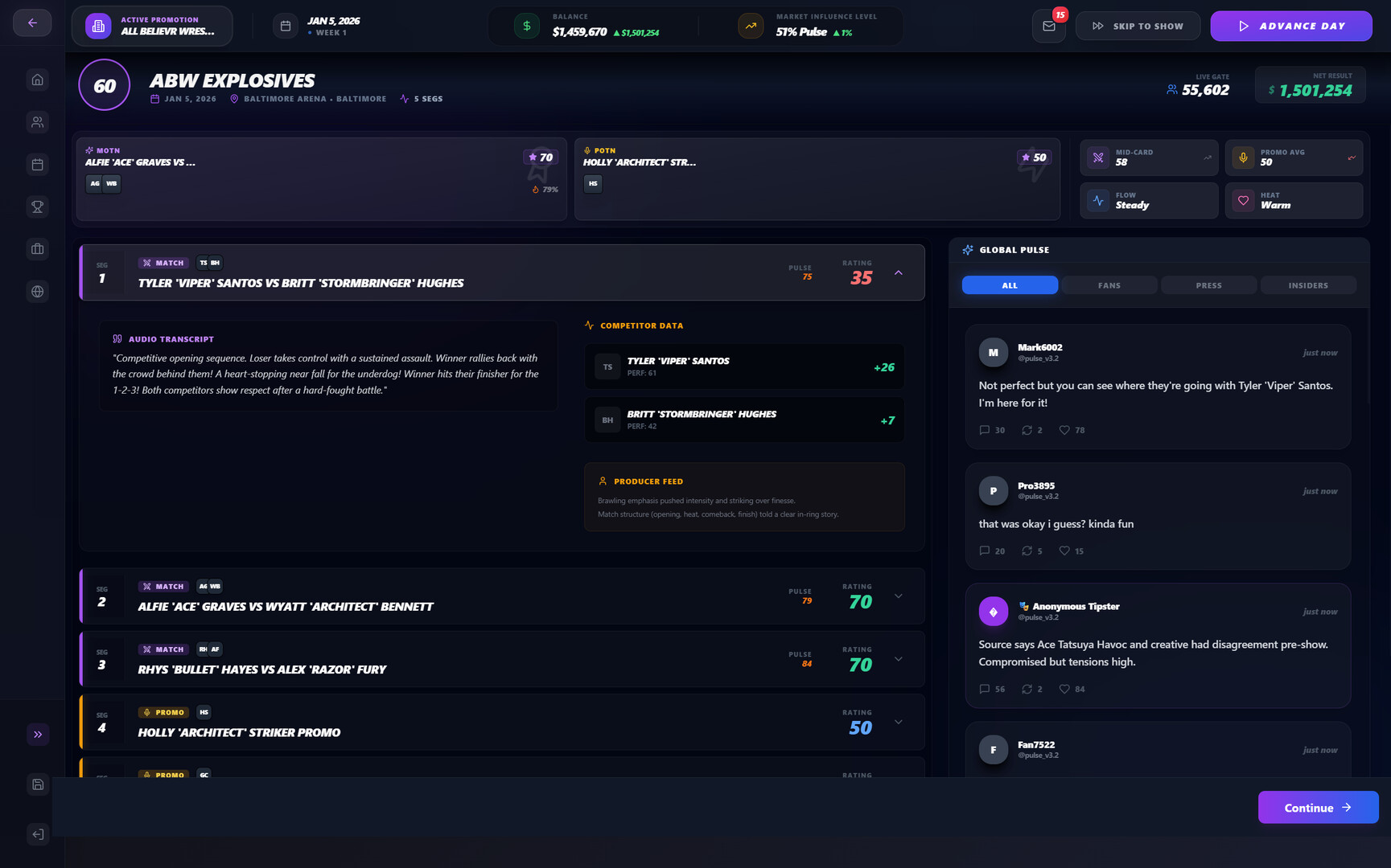 Custom promo flow system to shape promos, confrontations, and angles instead of relying on canned results