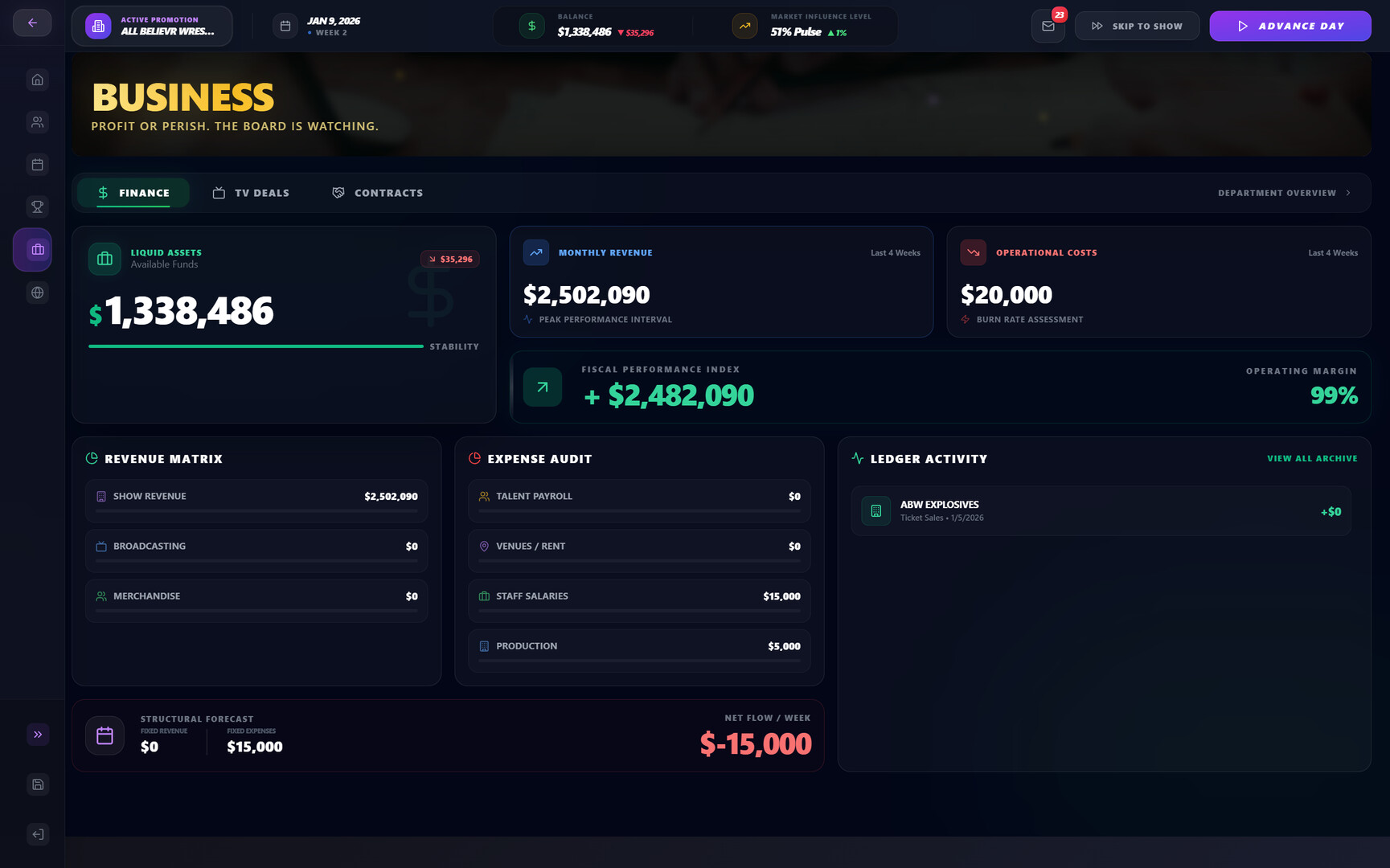 Believr Pro Wrestling is a wrestling promotion management simulation focused on decision-making, pressure, and long-term consequences. You control how shows are built, how matches and promos unfold, and how your roster develops over time, but outcomes are never guaranteed. Momentum, ego, timing, and context all matter, and the wider wrestling world continues to evolve whether you’re ready or not.