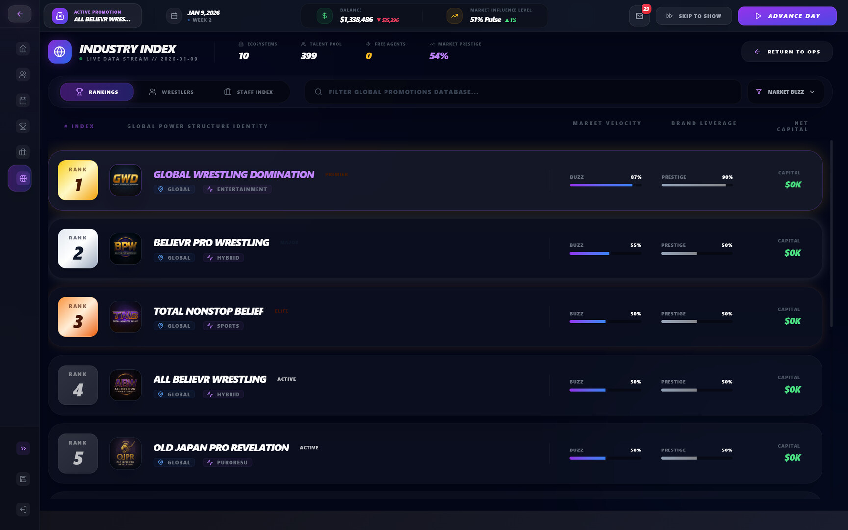 Living wrestling world with AI promotions that adapt their booking and strategy over time