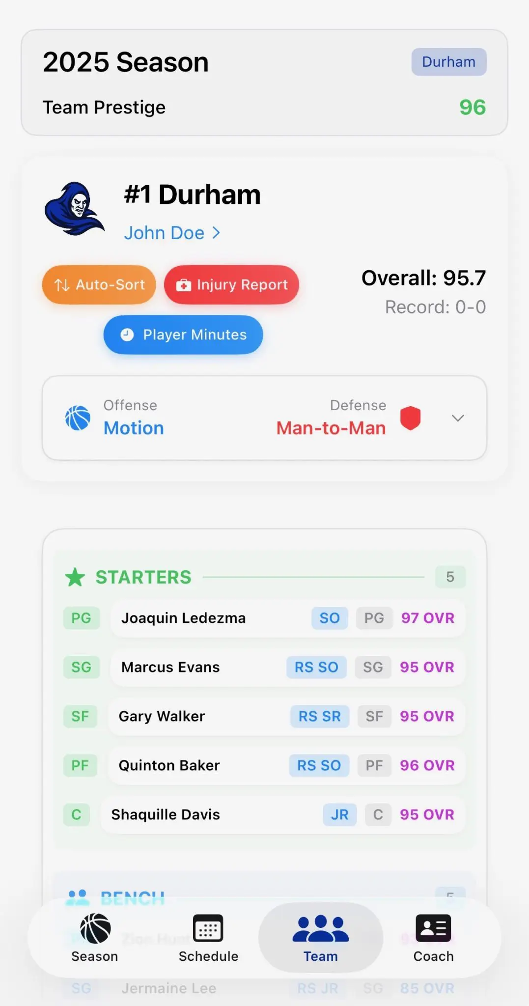 COACH: Start at any program and turn it into a national powerhouse. Manage seasons, rotations, minutes, injuries, and long-term player development as you build a team that dominates year after year.