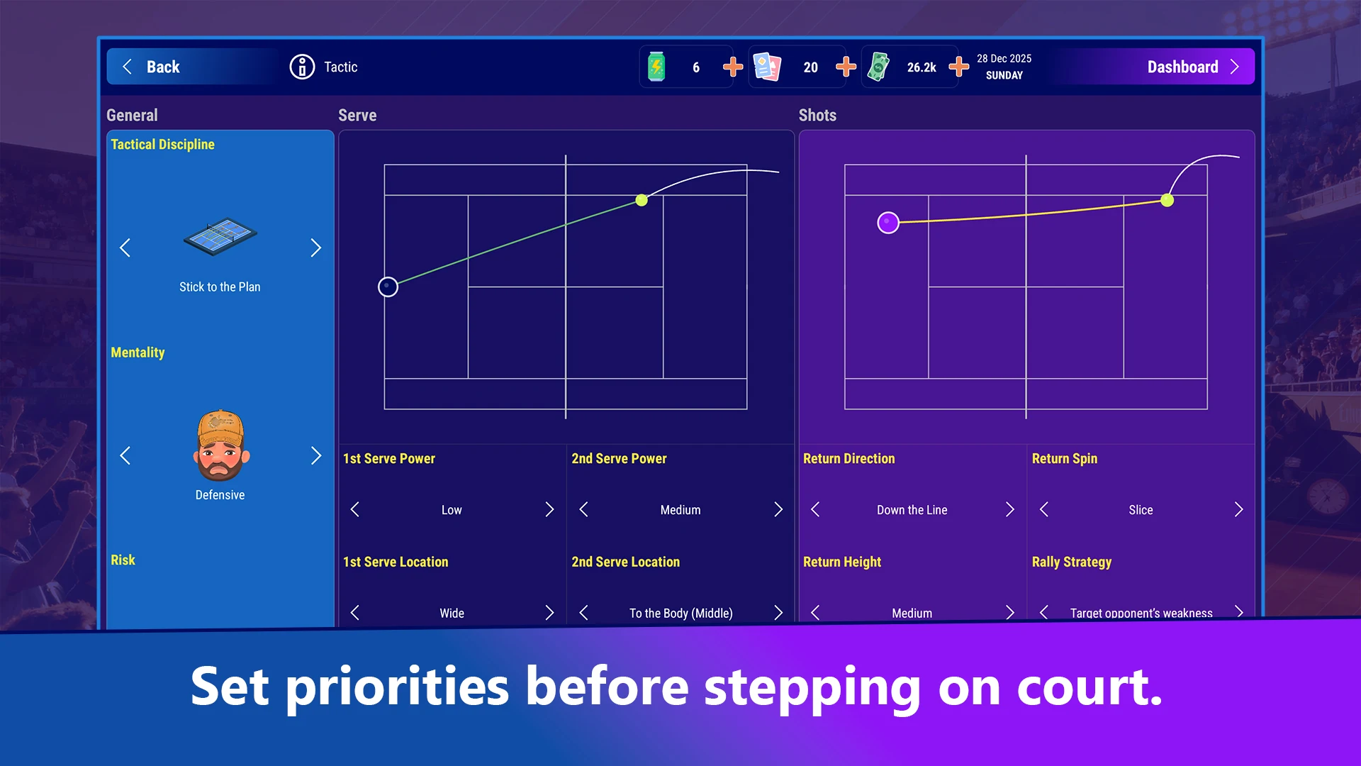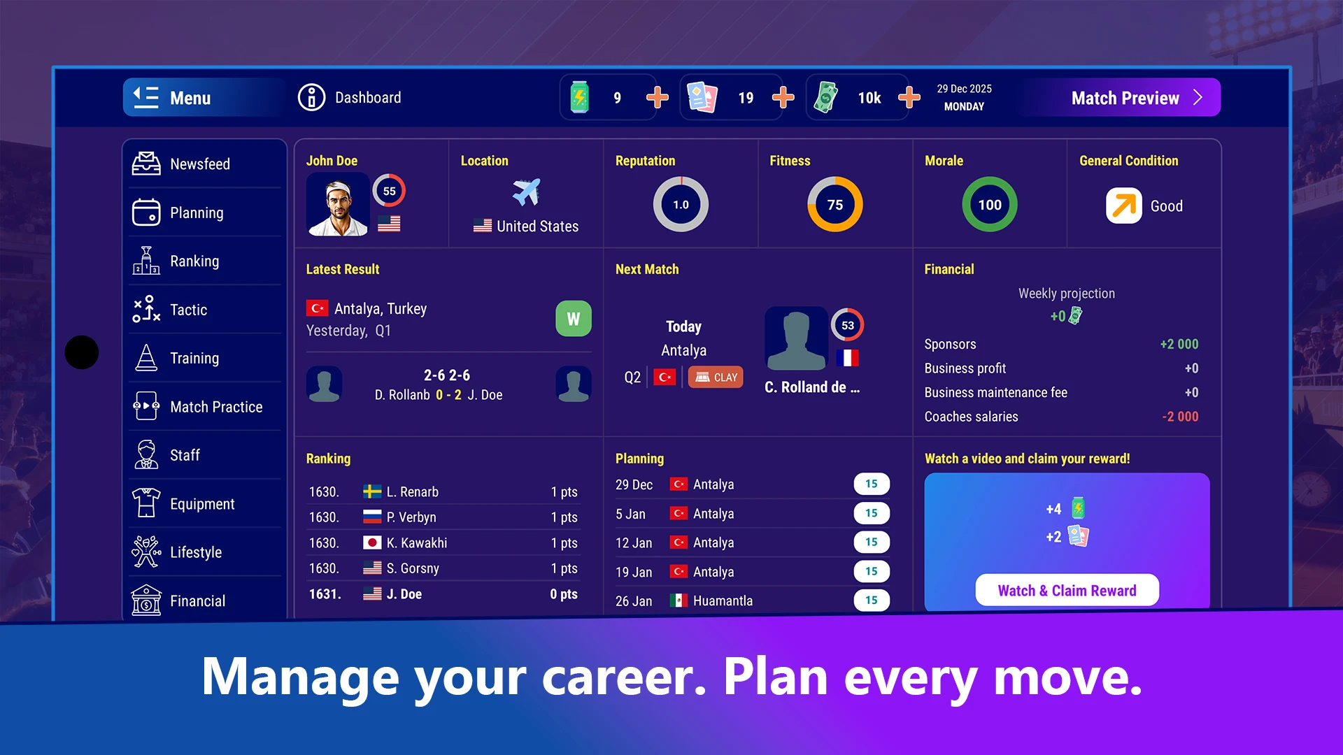 Build a professional tennis team to support your career. Hire coaches to improve player development and bring in an analyst to unlock advanced tennis match analysis, performance reports, and deeper strategic insights. Staff management plays a key role in long-term success in this tennis manager game.