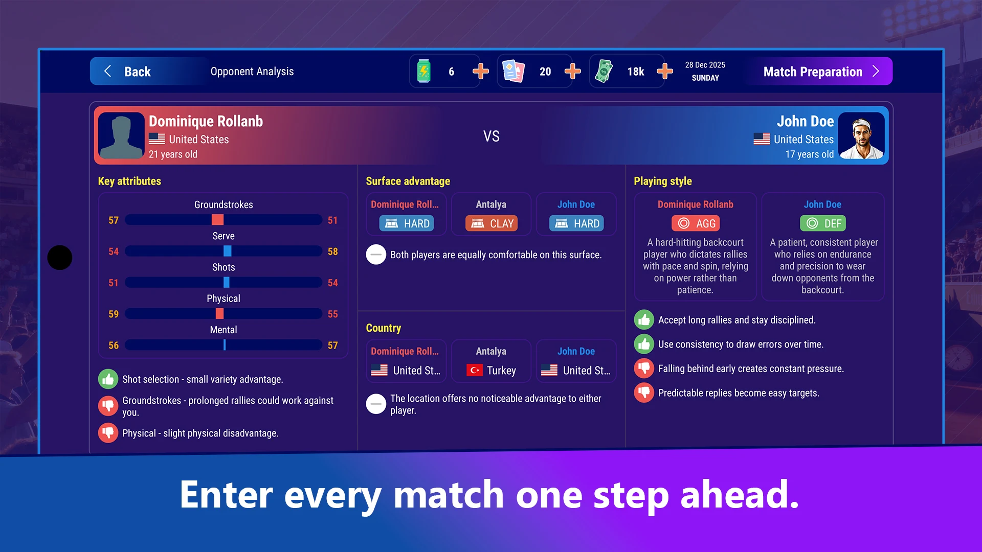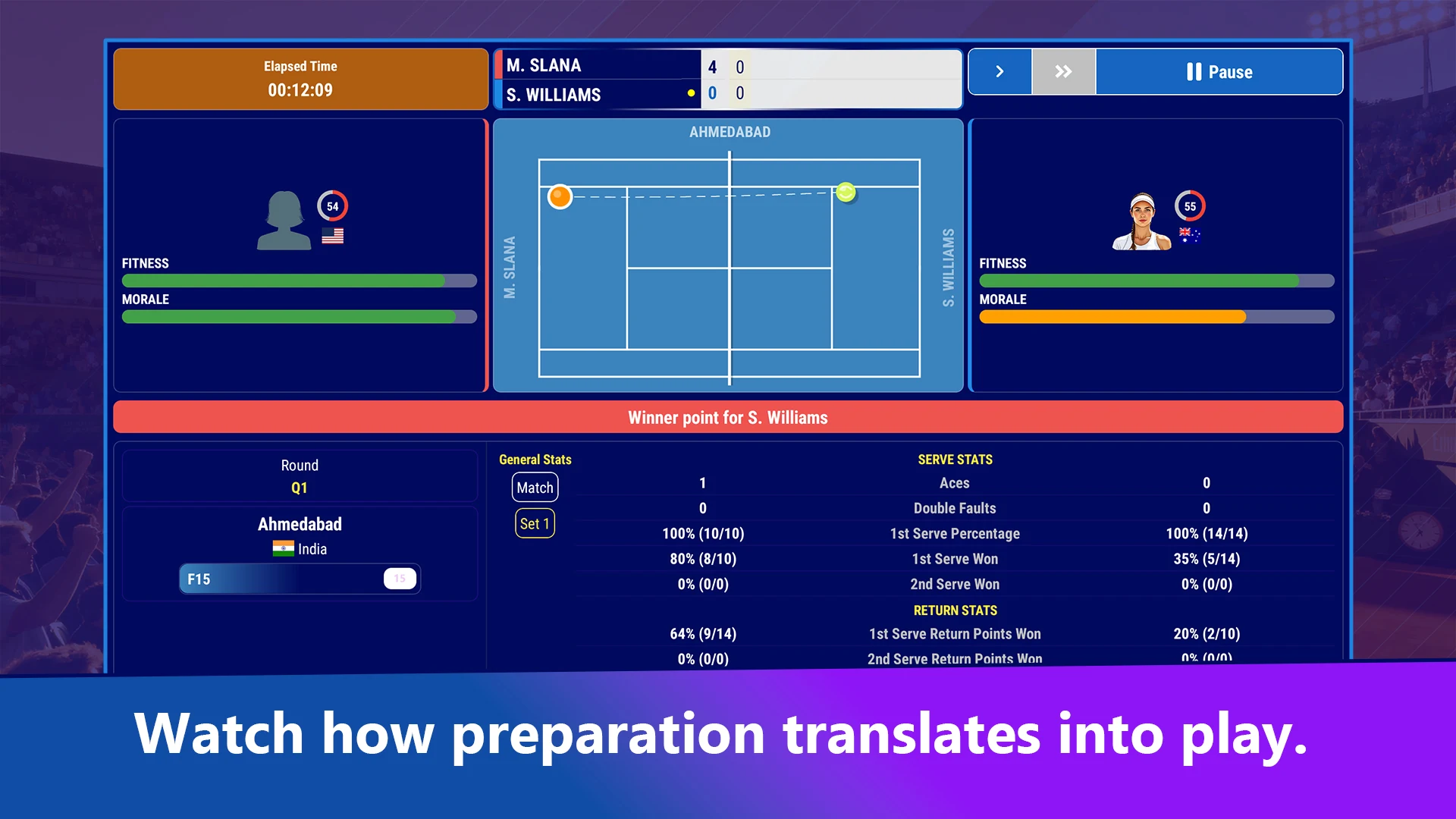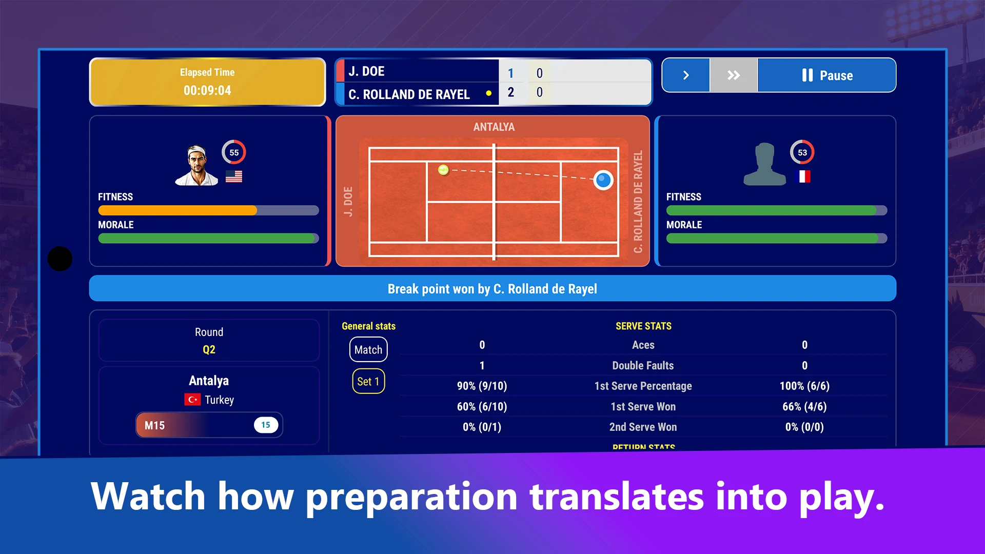 Watch tennis matches unfold through a detailed 2D simulation with realistic statistics including aces, double faults, serve and return performance, break points, total points, and games won. Prepare for each match by setting tactics in advance using opponent analysis, match previews, media predictions, and head-to-head history, then follow point-by-point tennis match events as the simulation plays out.