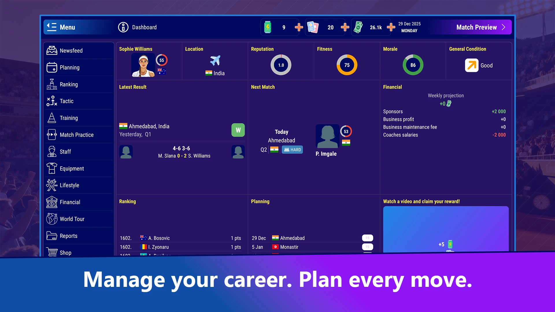 Pro Tennis Tour 26 is a tennis manager game and tennis career simulation where you create your own tennis player and manage every part of a professional tennis career. Plan training, manage energy, choose tournaments, and climb the world rankings in a deep tennis management simulation designed for long-term progression.