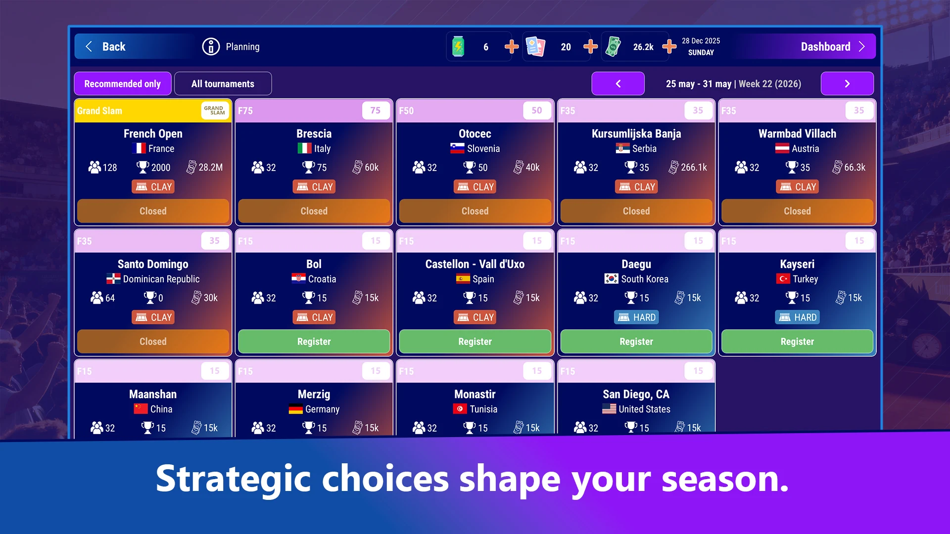 Create a tennis player and build a complete tennis career from early qualifiers to the highest level of the professional tour. Compete in realistic tennis tournaments, manage preparation on and off the court, and make strategic decisions that define your success in this tennis manager and career game.