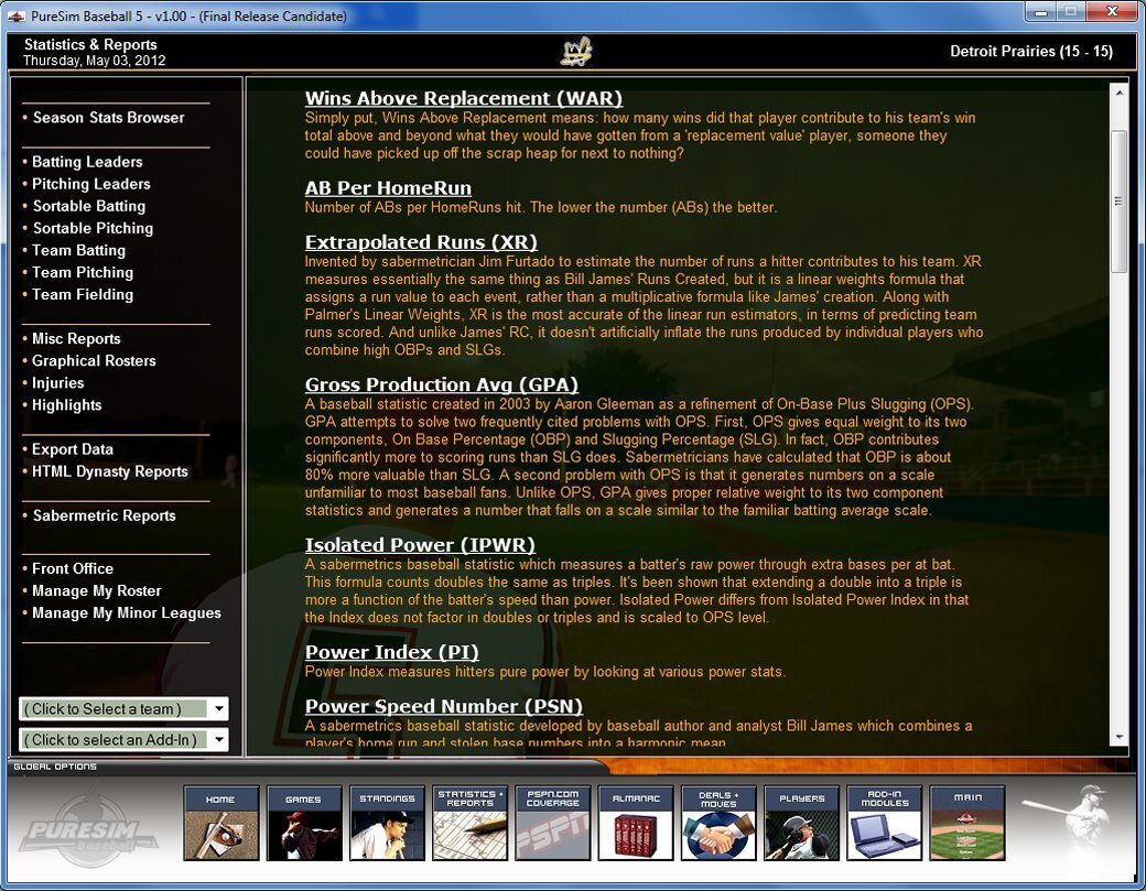 Opening a new game brings you a nice handful of options. You can start a game in PureSim classic mode, PureSim classic quick stars (you choose the number of teams, divisions, etc.), Major League Career (choose your year and format), Major League Career Tru-Transaction mode (you manage, GM makes moves as they occurred in real life), and Sandbox mode (any season 1900-present, with real players if you wish). Finally, you can choose your ratings format: 1-100, the 20-80 scouting scale, a number of 1-xx formats, and finally, no scoring whatsoever. The last option is how you want finances, market sizing, and free agency to work. You can be the equalizer with all markets the same size, or you can have it just like it is.