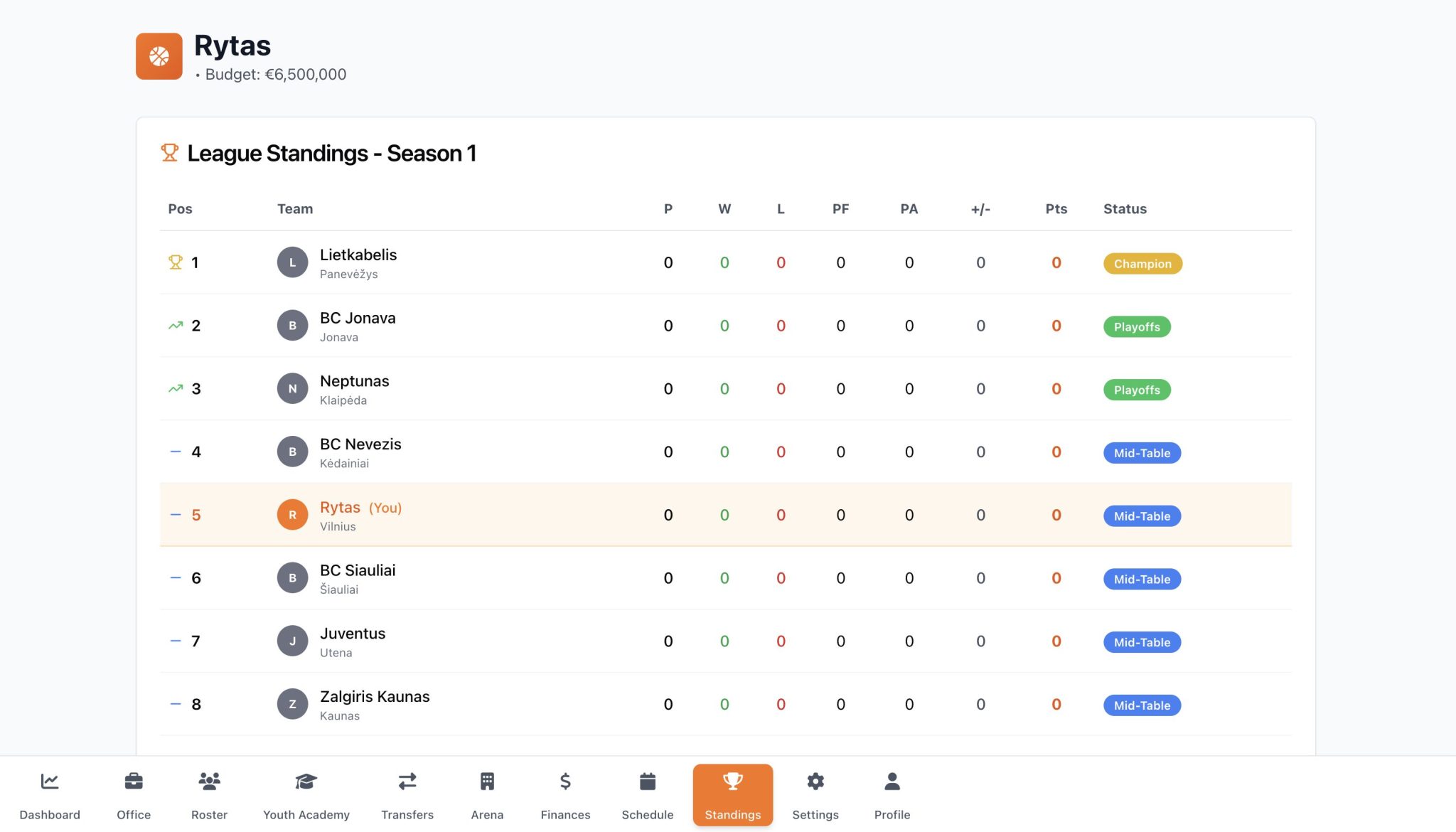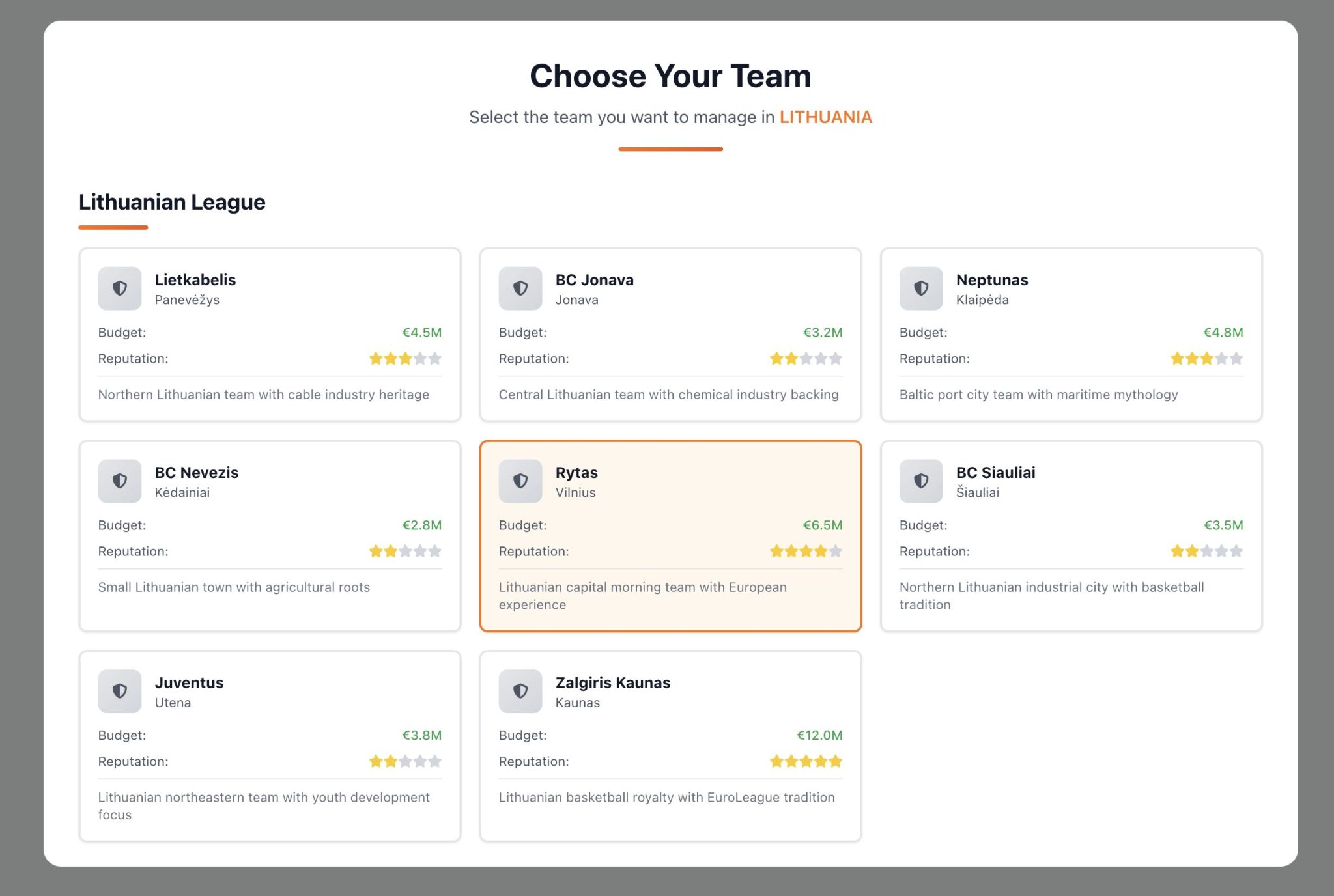 Monitor all major European championships simultaneously. Track your progress from local leagues to EuroLeague qualification. Face authentic teams from Serie A1, Liga ACB, Basketball Bundesliga, and more prestigious competitions.