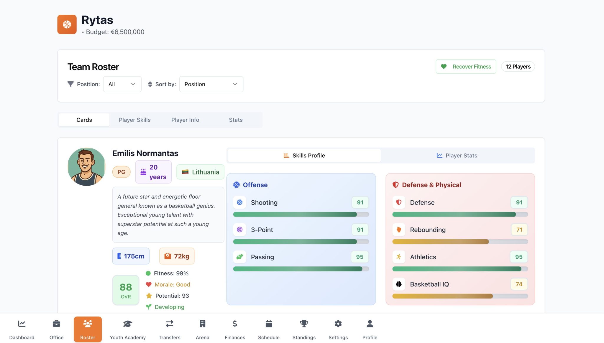 Analyze every aspect of your players with comprehensive skill breakdowns, physical attributes, and development potential. Track shooting, defense, rebounding, and basketball IQ to build the perfect team chemistry.