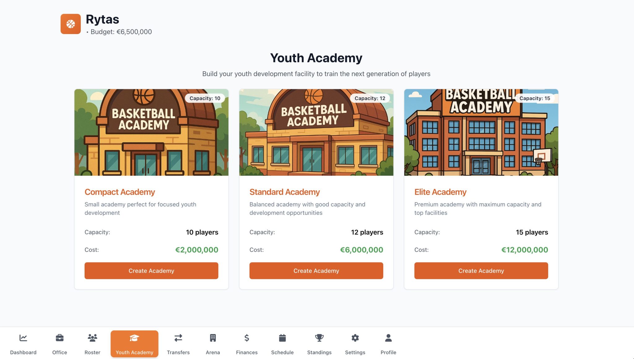 Discover the next generation of basketball talent through our advanced youth academy system. Scout promising prospects, track their development progress, and sign them before rival teams notice.
