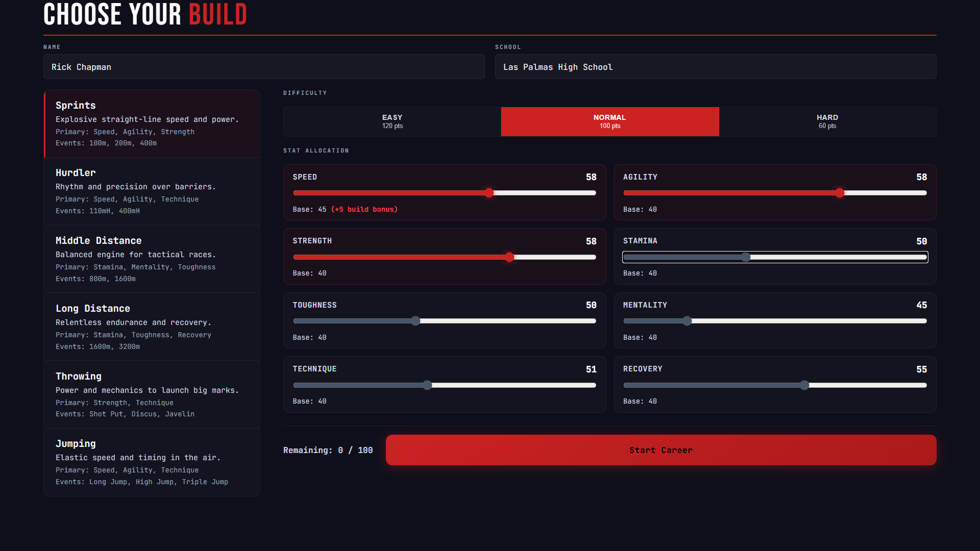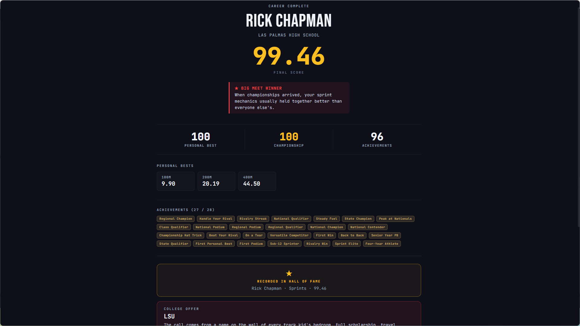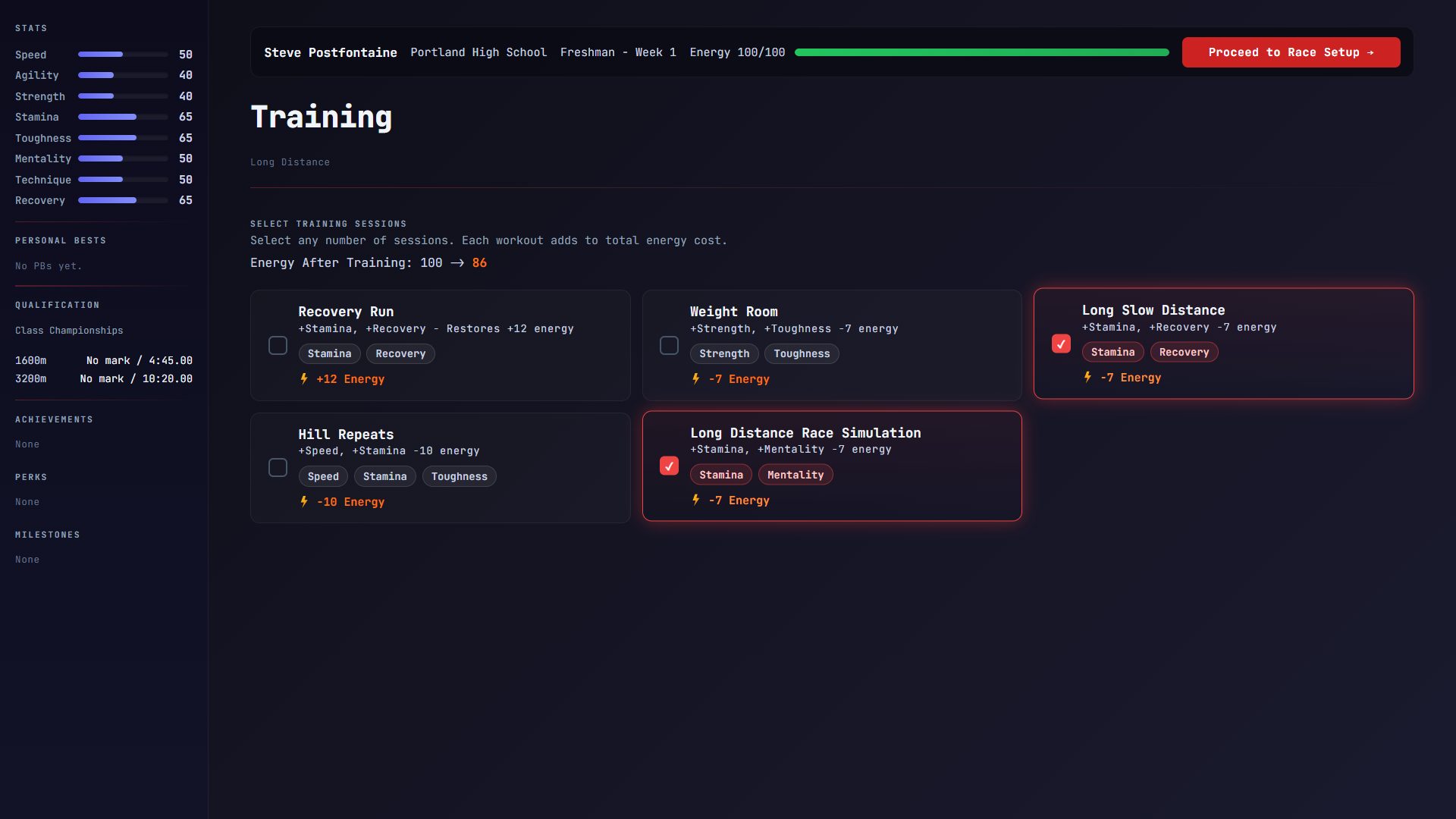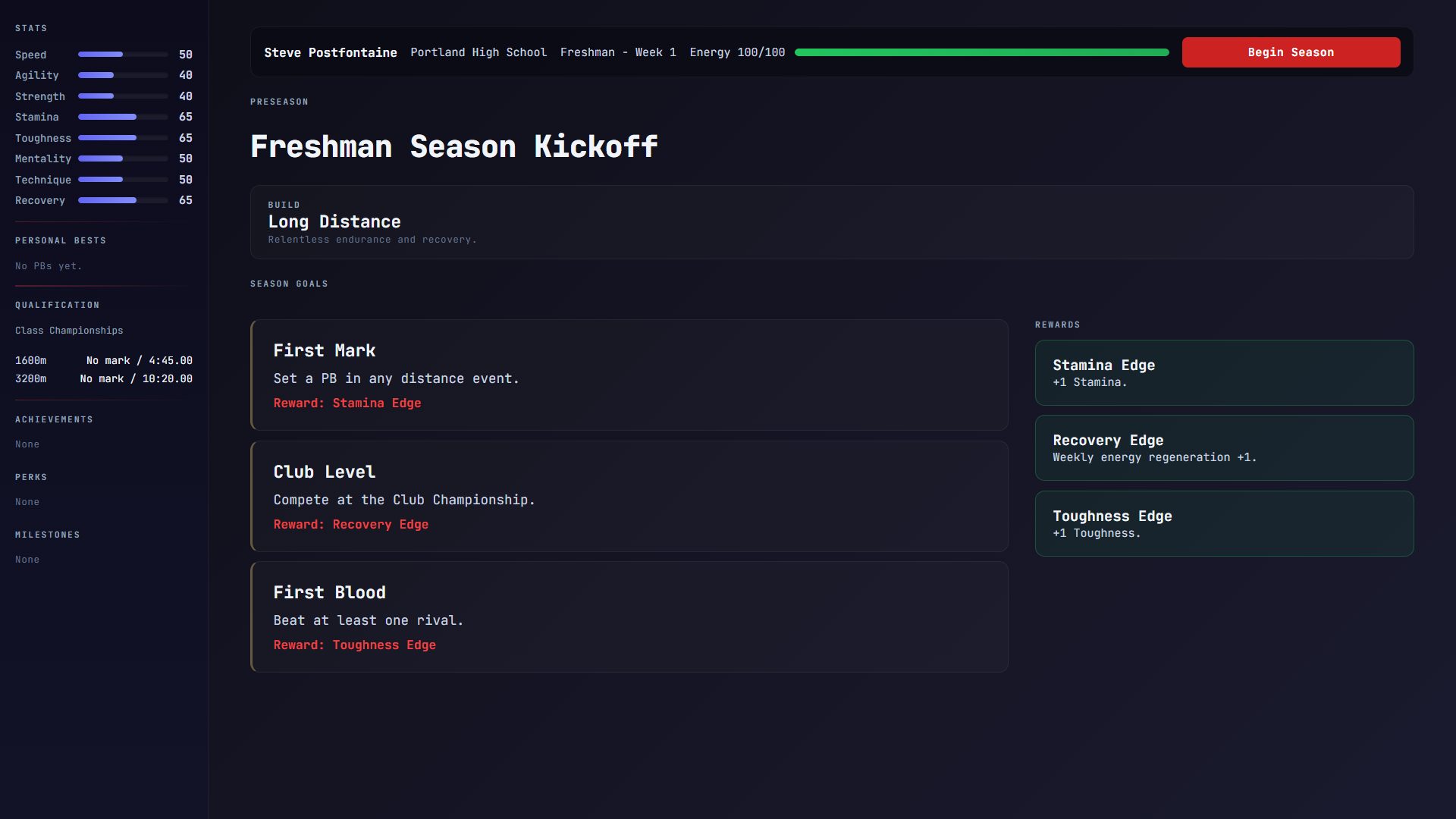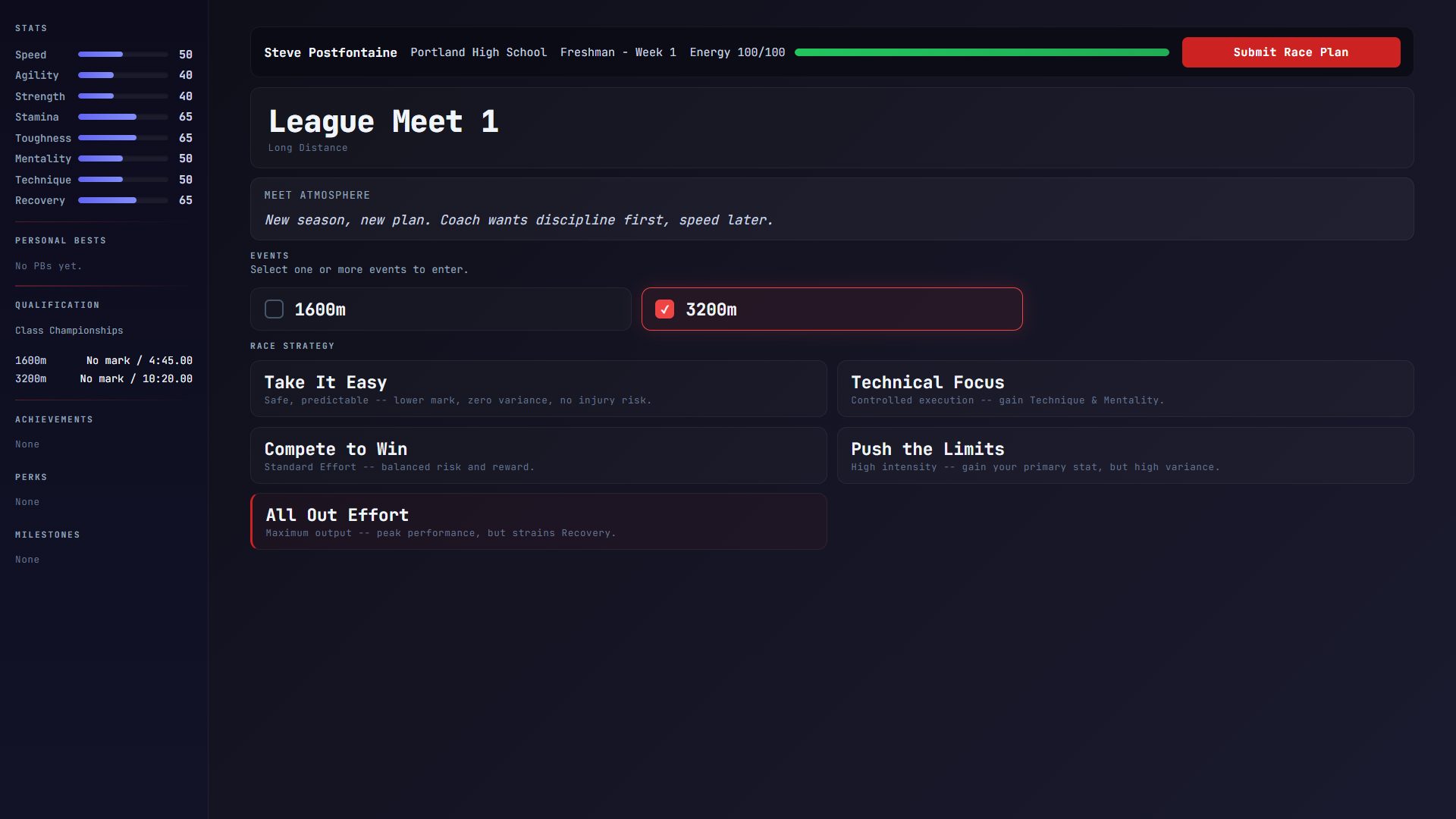 Track Star is a high school track & field career simulation spanning your entire athletic life — freshman tryouts to senior day. You choose your specialty, build your athlete week by week, and find out whether you had what it takes. Some athletes make nationals. Most don't. Both are valid outcomes.