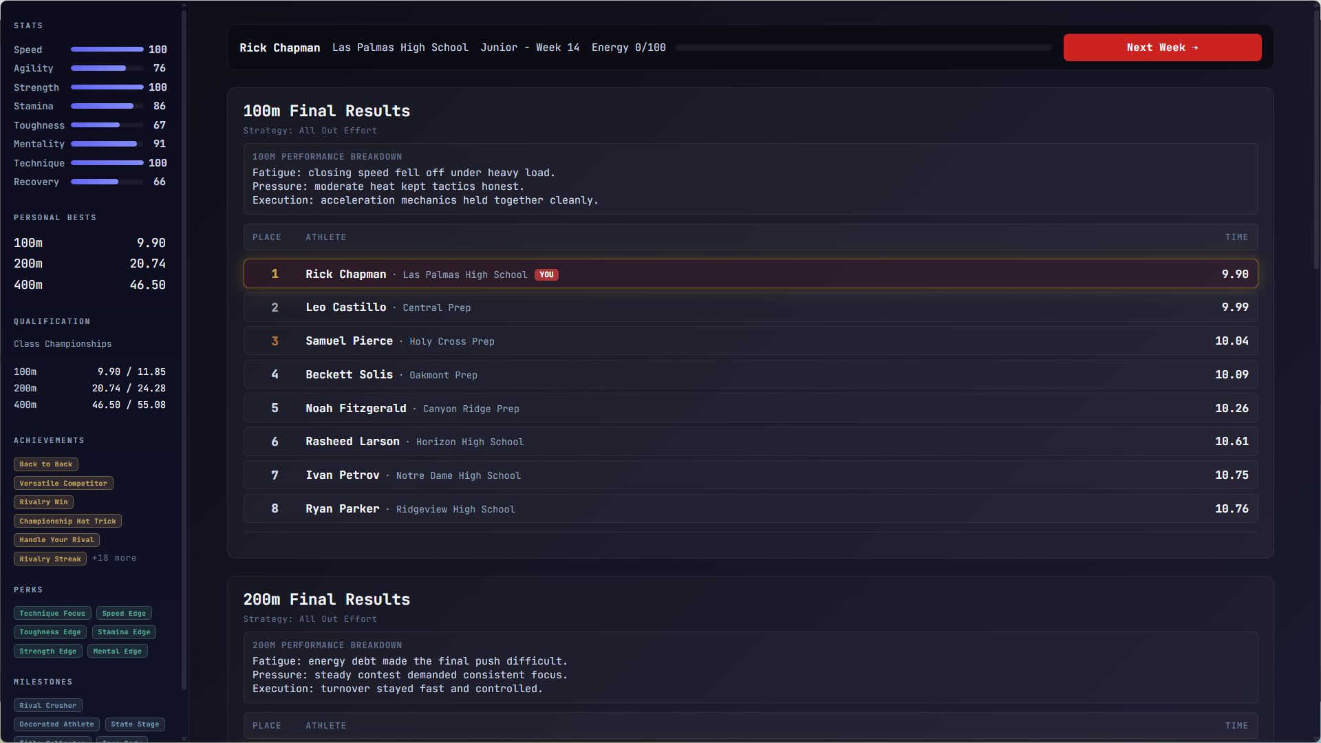 Every career has a rival. They show up at your meets, they remember your times, and they're not rooting for you. Whether you chase them down or spend four years in their shadow depends entirely on the athlete you built.