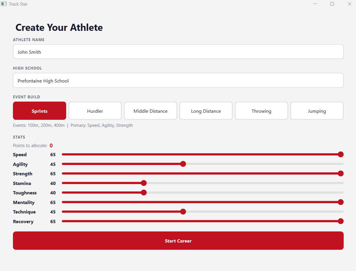 Choose your events, manage your training, and balance effort against fatigue as you compete through regular season meets, championships, and — if you qualify — state and national competition. Develop eight core stats, navigate rival athletes, and see how far your career can go.