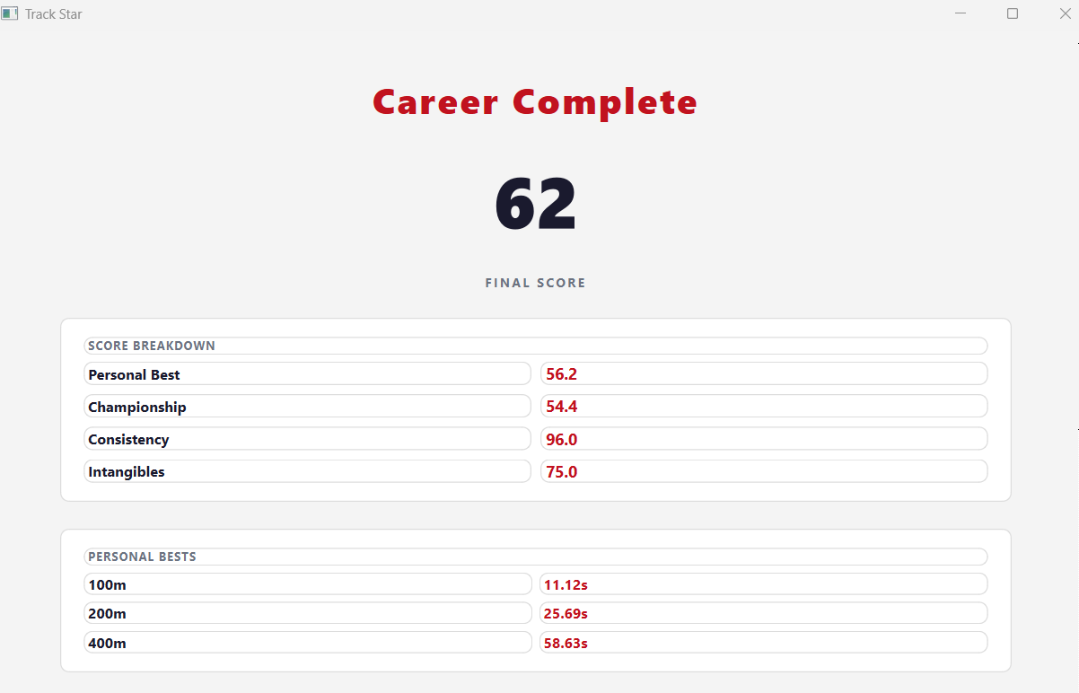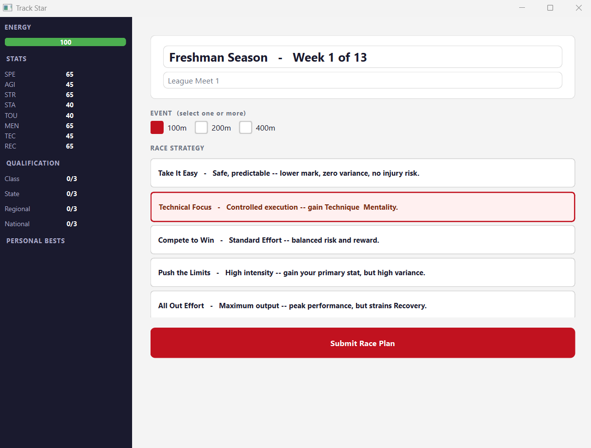 Track Star is a high school track & field career simulation where you build an athlete from freshman year to senior year — one week at a time.